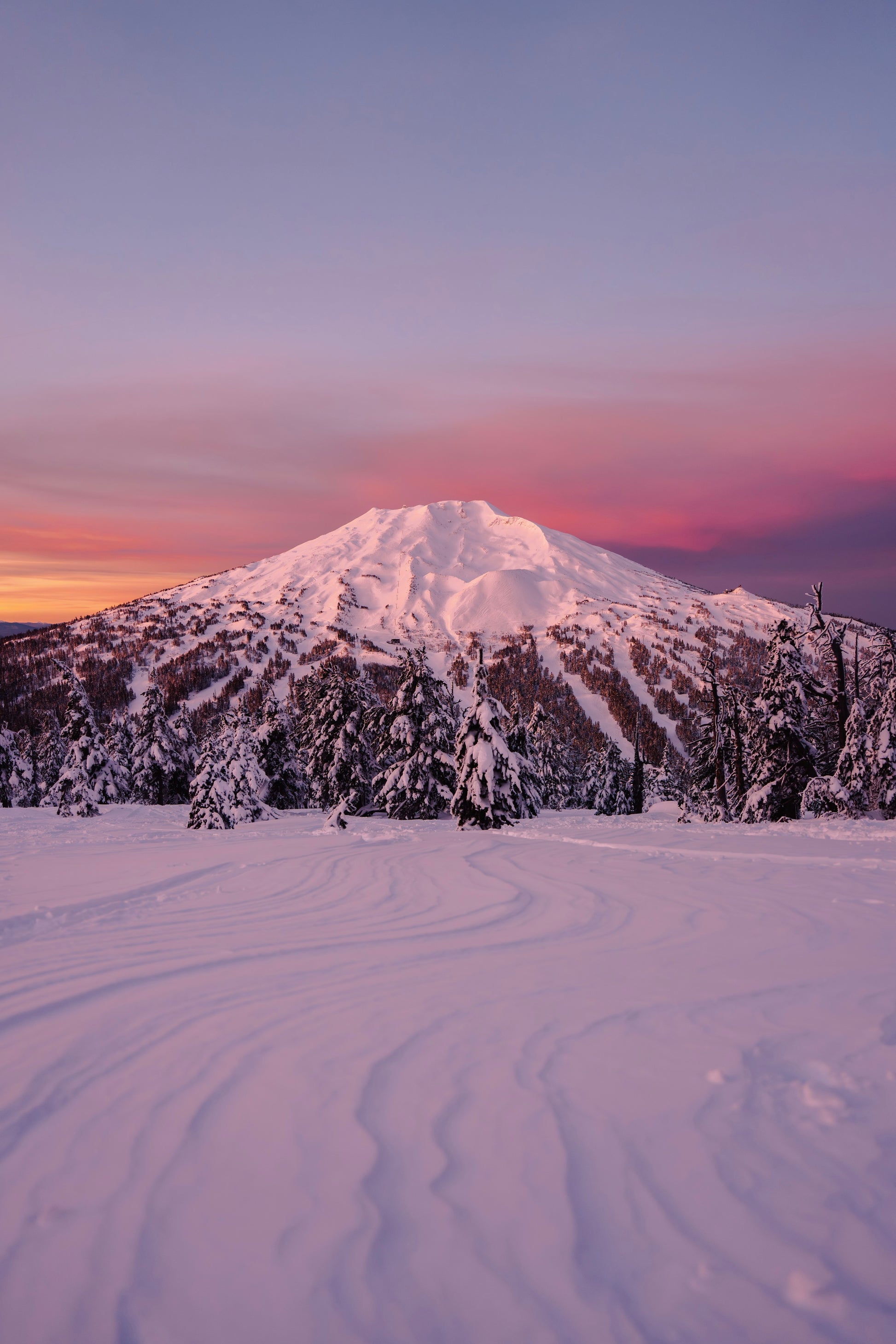 Wind creating a gorgeous snow pattern in the foreground with Mt. Bachelor at sunrise in the background.
